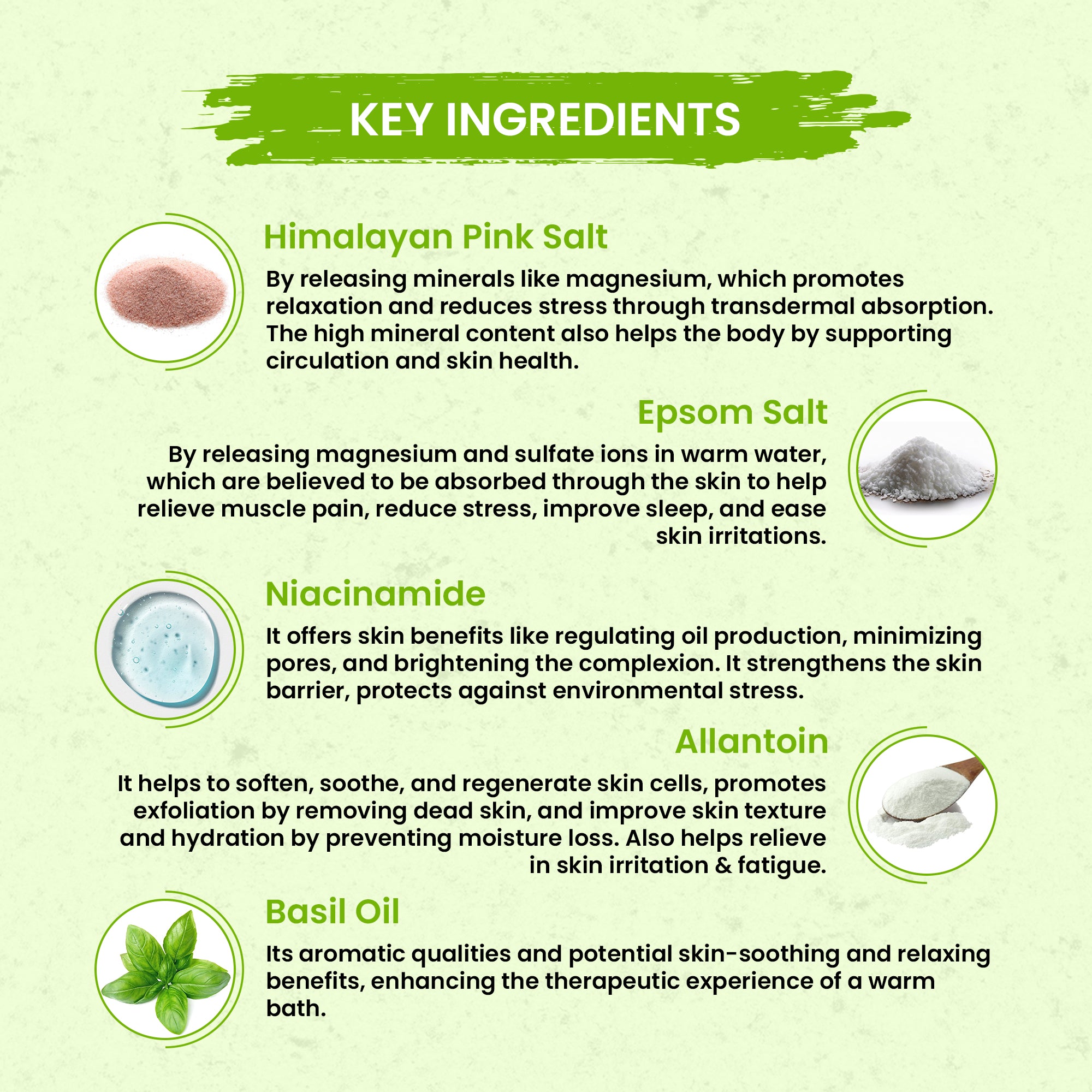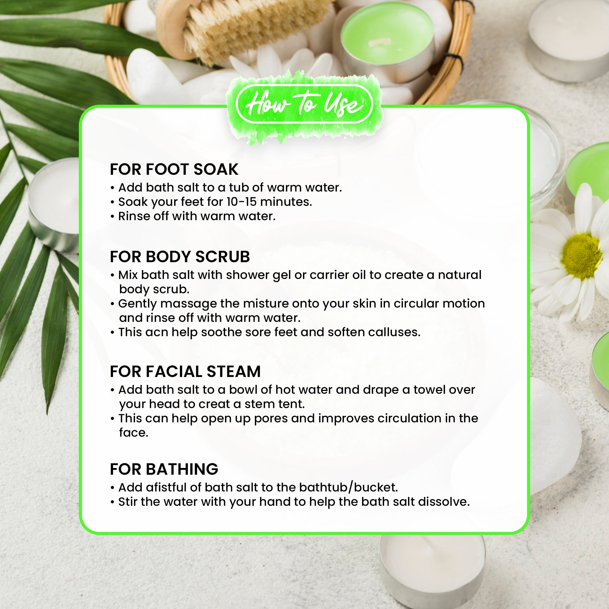 - FOR BODY SCRUB- • Mix bath salt with shower gel or carrier oil to create a natural body scrub. • Gently massage the mixture onto your skin in circular motion and rinse off with warm water. • This can help soothe sore feet and soften calluses.