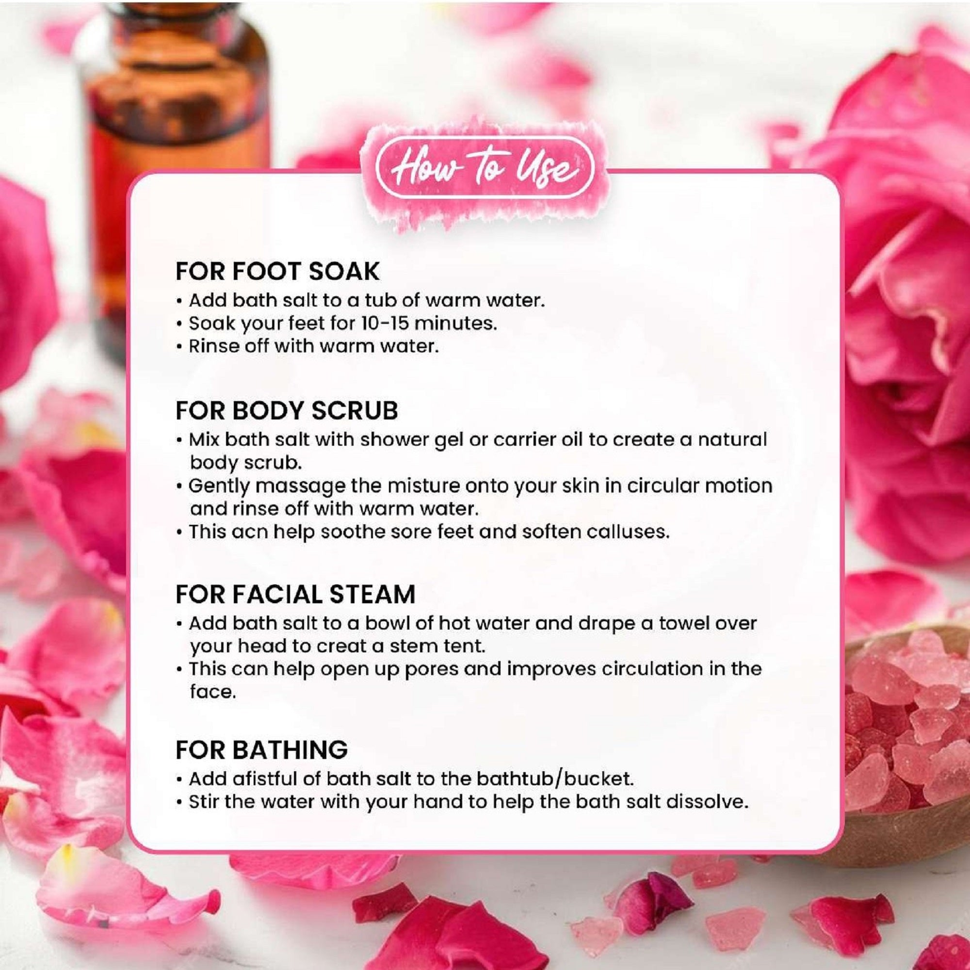 - FOR BODY SCRUB- • Mix bath salt with shower gel or carrier oil to create a natural body scrub. • Gently massage the mixture onto your skin in circular motion and rinse off with warm water. • This can help soothe sore feet and soften calluses.