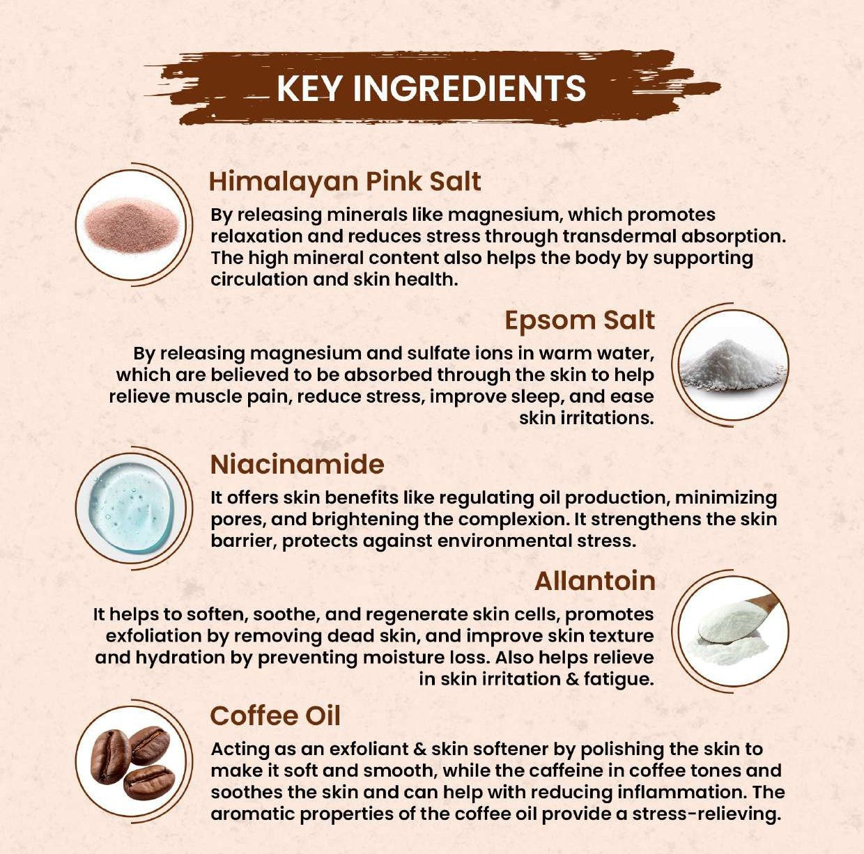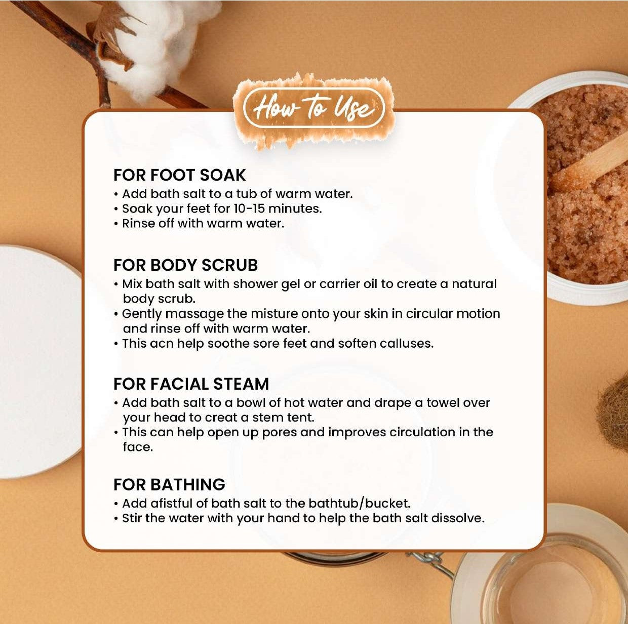 • FOR BODY SCRUB- • Mix bath salt with shower gel or carrier oil to create a natural body scrub. • Gently massage the mixture onto your skin in circular motion and rinse off with warm water. • This can help soothe sore feet and soften calluses.
