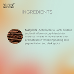 Anti bacterial , anti oxidant and anti inflammatory Manjishta extracts inhibits many benefits and promotes skin whitening fading skin pigmentation and dark spots.